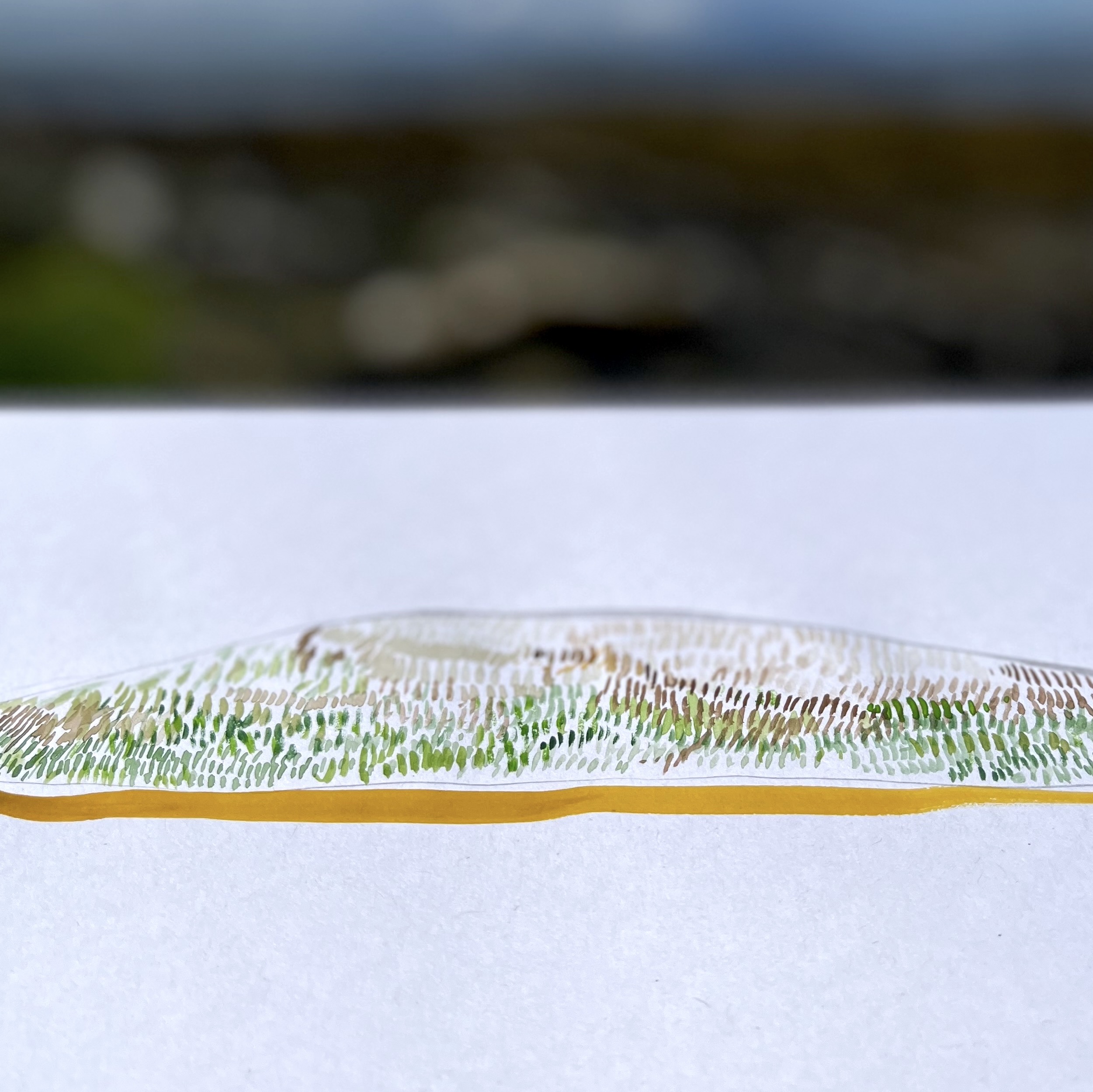 Recently while I was sketching I concentrated on the parts of the landscape that could be seen before the Hoy Hills, changing the perspective, distance and how I see them. My focus was drawn to the sand edging Lamb Holm – the sun was shining brightly, making it glow. I focused in on small details and ignored the parts I didn’t want to see, played around with lines, marks and colours.