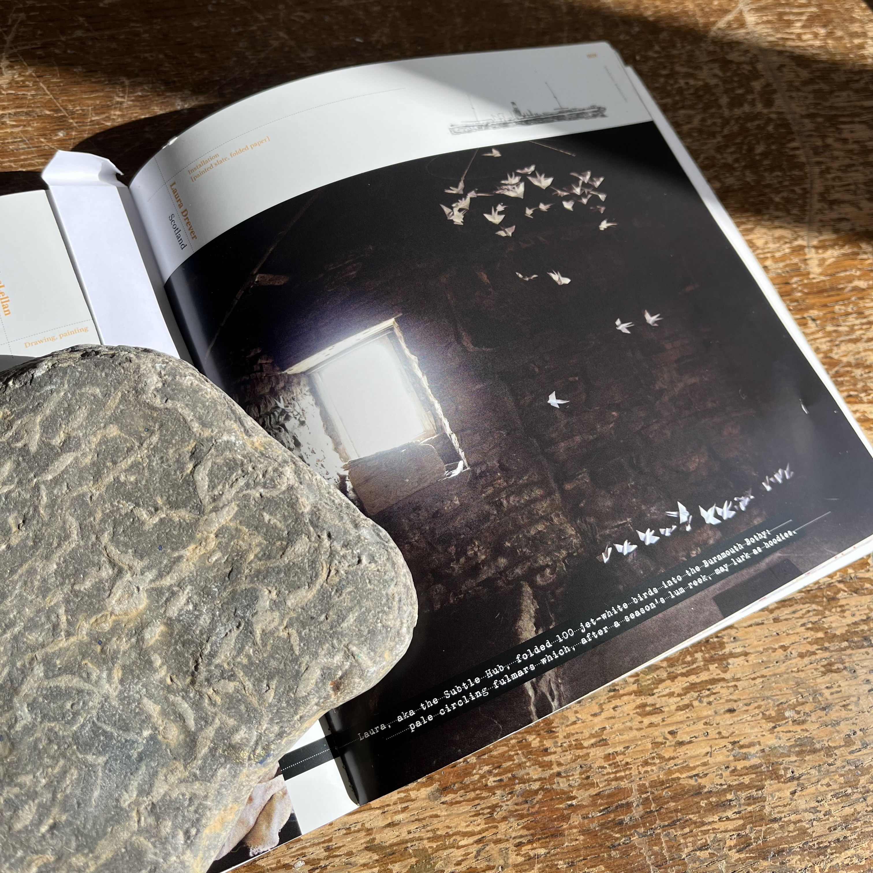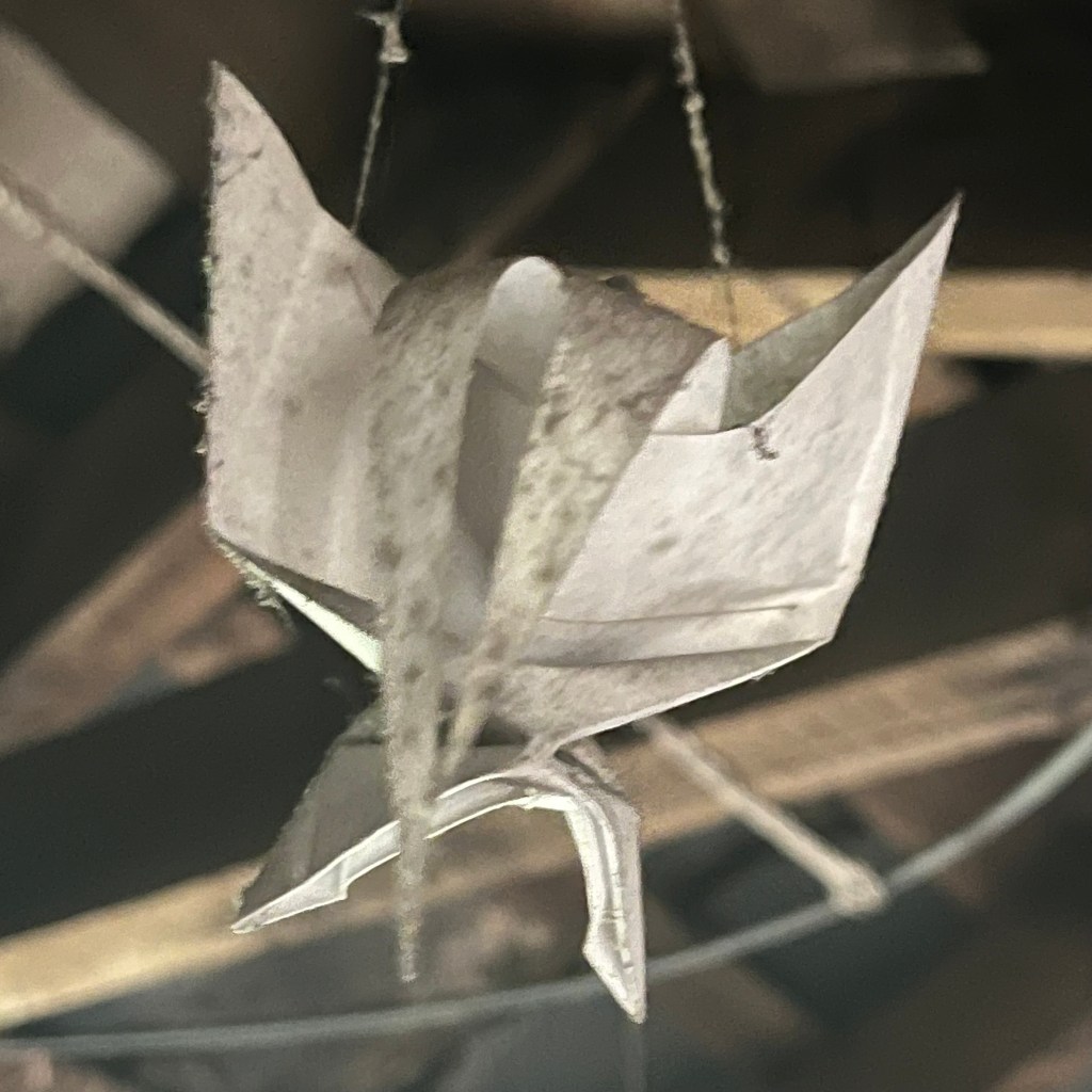In 2008 (the year I was pregnant with my first child) I folded 100 paper birds while on a residency with 20 International artists. The birds have just had their 16th birthday. There are 10 still hanging in Burnmouth Bothy.