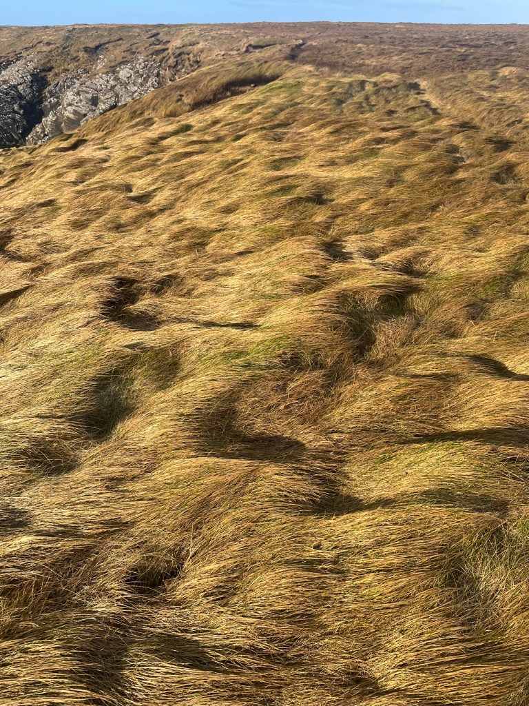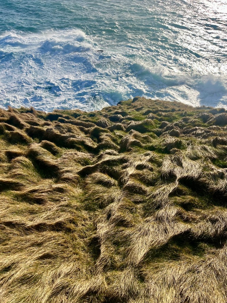 It was so windy on the walk that all I could think about was getting to where I wanted to go. The winter early morning light was doing the thing I like best and making the wind blown tussocks look golden and weathered and worn. The dog was scratching his back every now in again in the grasses, getting comfy, enjoying the surroundings. Signs of new growth were visible. The waves were spraying over the cliffs and my skin felt a bit salty when I got home.