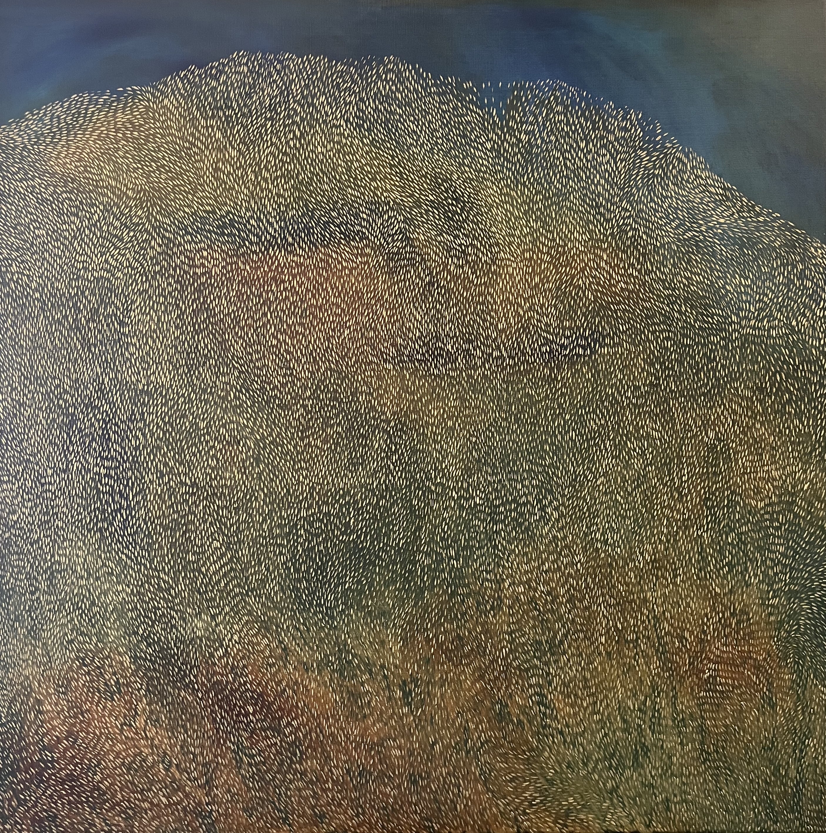 “The modern Orkney landscape is characterised by the agricultural developments of the last 150 years or so, which saw a complete transformation in appearance from common grazing and piecemeal cultivation, to squared-off, drained and ordered fields. The higher up and more difficult to reach places, that proved impossible to put under the plough, endured, and most outlooks across the islands are capped by a contrasting layer of rough grass and heather. It is to these more rugged and untamed landscapes that Laura Drever is most often attracted, and repeated visits to places like Orphir, Hobbister and Scapa have given the artist a deep understanding of the fabric and form of these and other iconic Orkney landscapes. Hoy (or Háey, the high island), is also a favoured location.”