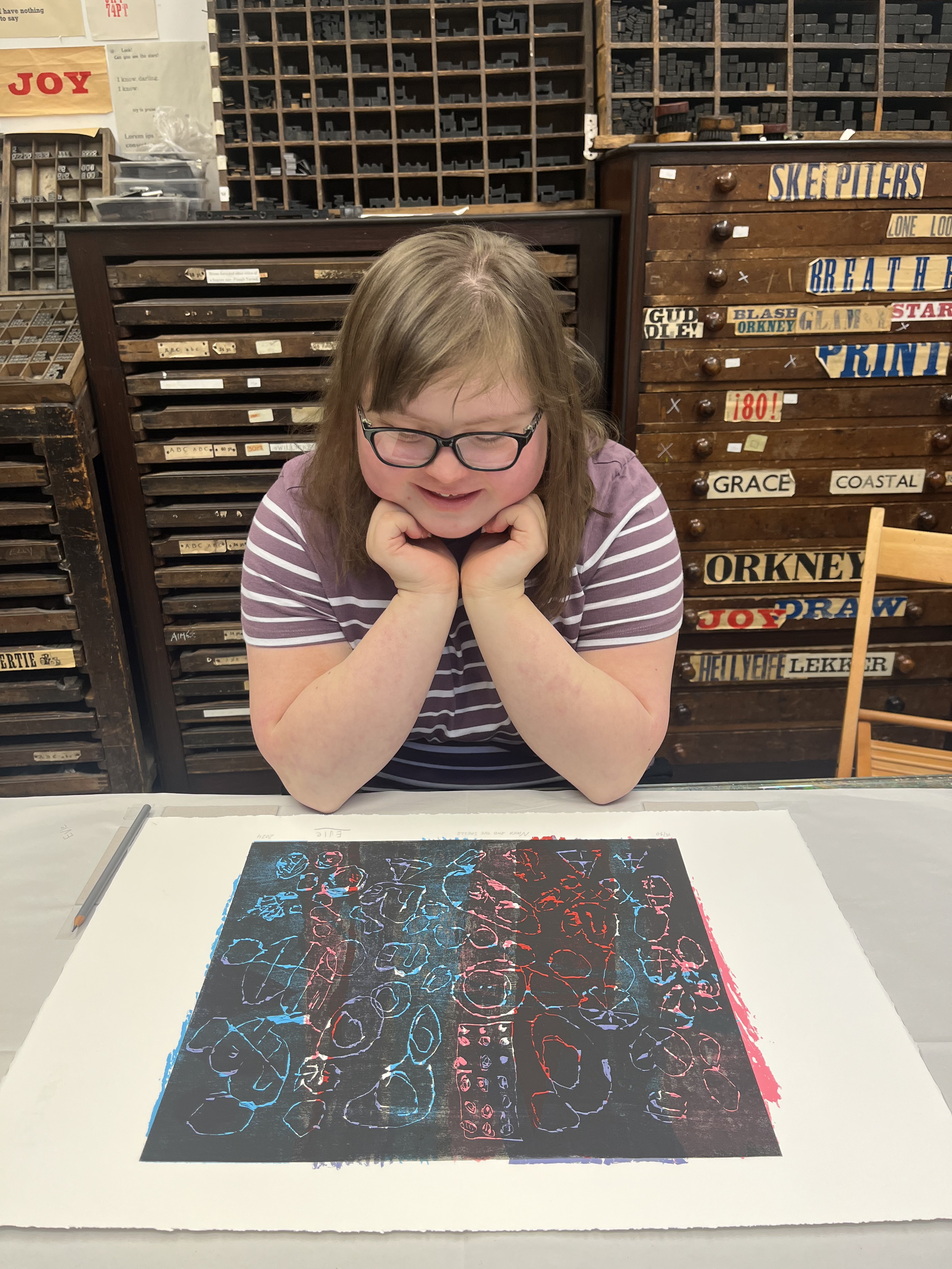 At the end of last week I was delighted to assist Evie in completing her printmaking project with Soulisquoy Printmakers. Evie Hone is a young adult and artist with a learning disability, who I support and encourage in her creativity.