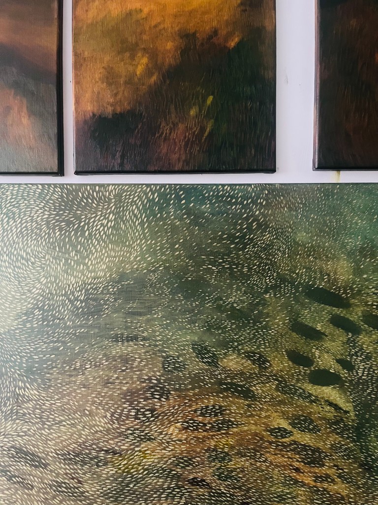 Skrimings is my submission. A painting of light and land, ebb and flow. Each panel is named separately from descriptive words from the Old Norn by Hugh Marwick. Perhaps it’s a poem too?