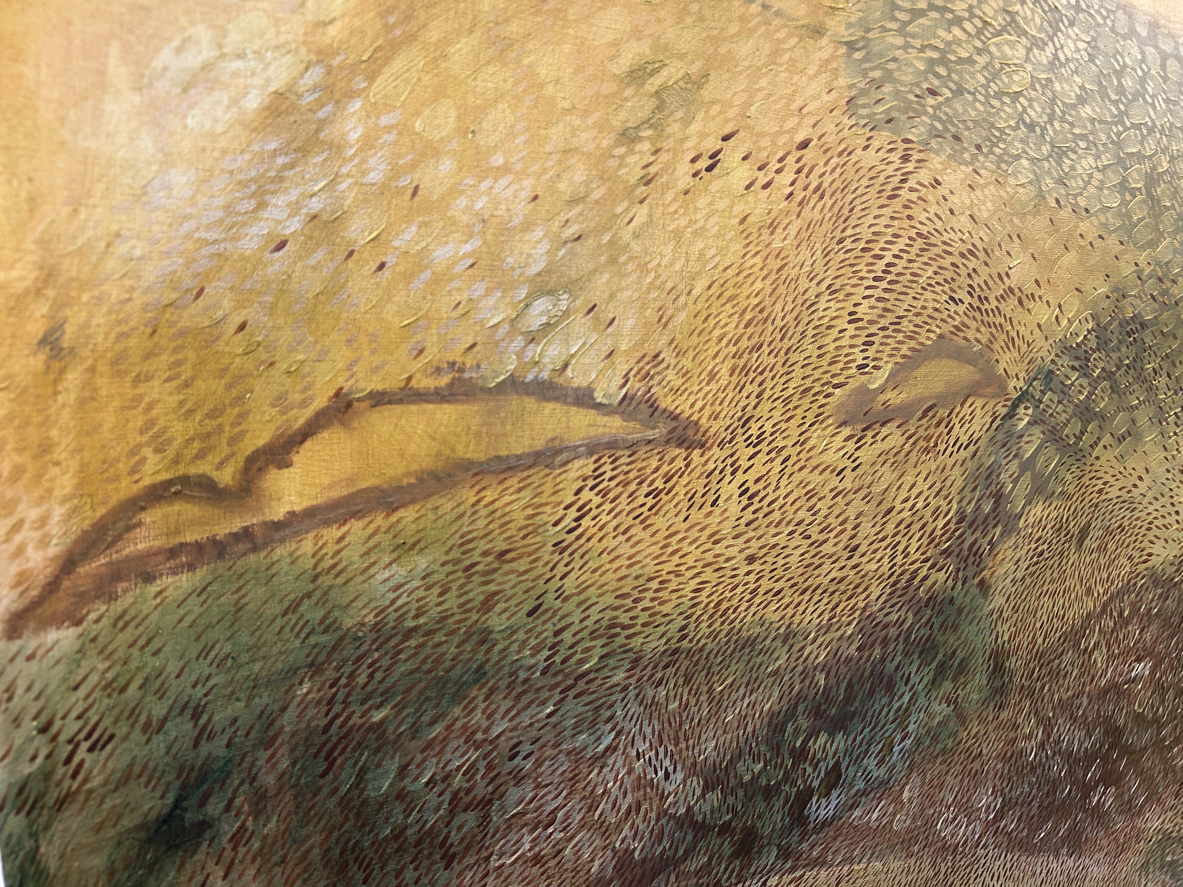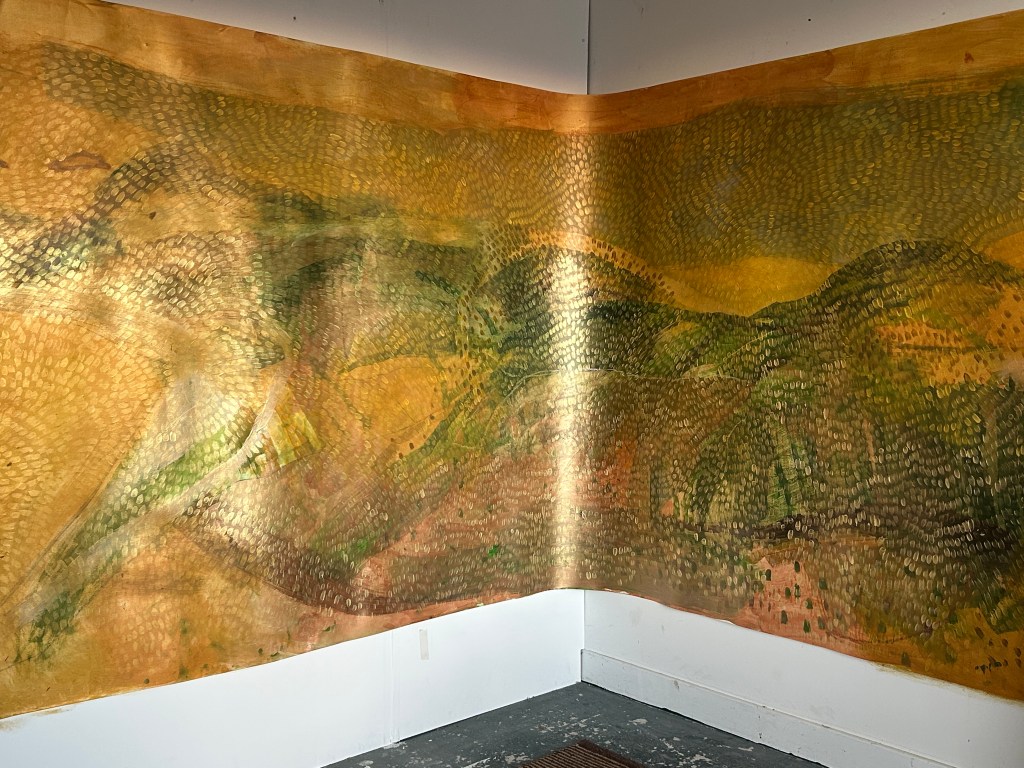 For now, I am working away behind the scenes quietly on a large drawing. It initially started as a quick study of the view from the studio – a personal project that was to be quick and allow me to explore new ideas. It has been worked on outside in the sun, covering the floor while paint has been splashed and now pinned to the wall, where it has completely taken me under it’s spell of spending hours making tiny marks. It has been a welcome addition to the other work that needs done and helping me stay calm in the excitement and anticipation of what is next.